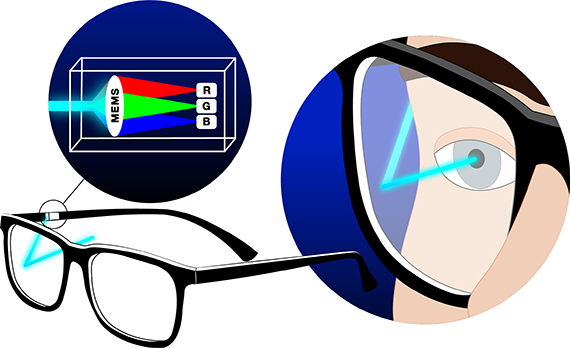 Durch den ebenfalls am Brillenbügel angebrachten Mikroscanner MEMS gelenkt, trifft der Laserstrahl dann in unterschiedlichen Winkeln durch die Pupille auf die Linse. Diese leitet den Strahl fokussiert auf die Netzhaut. Dort baut der Laser durch einzelne Bildpunkte das virtuelle Bild in der Retina auf. Da immer nur mit einem Laserstrahl gearbeitet wird, ist das Displaysystem sehr klein. Gleichzeitig ist die Leistung des Lasers so gering, dass kein Risiko für das Auge besteht.
