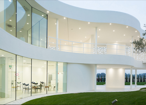 Alles ist so geplant, dass der Mensch im Mittelpunkt steht. Architektur und Licht sollen dazu beitragen, dass die 140 Mitarbeiter sich rundum wohlfühlen. Entstanden ist ein futuristisch anmutender Komplex, der eine Atmosphäre der Leichtigkeit ausstrahlt. Bei der Umsetzung seines Lichtkonzepts vertraute der Designer Beppe Riboli vollständig auf die Kompetenz von Osram. Aufgrund dieses ganzheitlichen Ansatzes harmonieren die komplett steuerbaren und dimmbaren LED-Leuchten perfekt miteinander und sind die ideale Untermalung für Ribolis innovative architektonische Leistung.