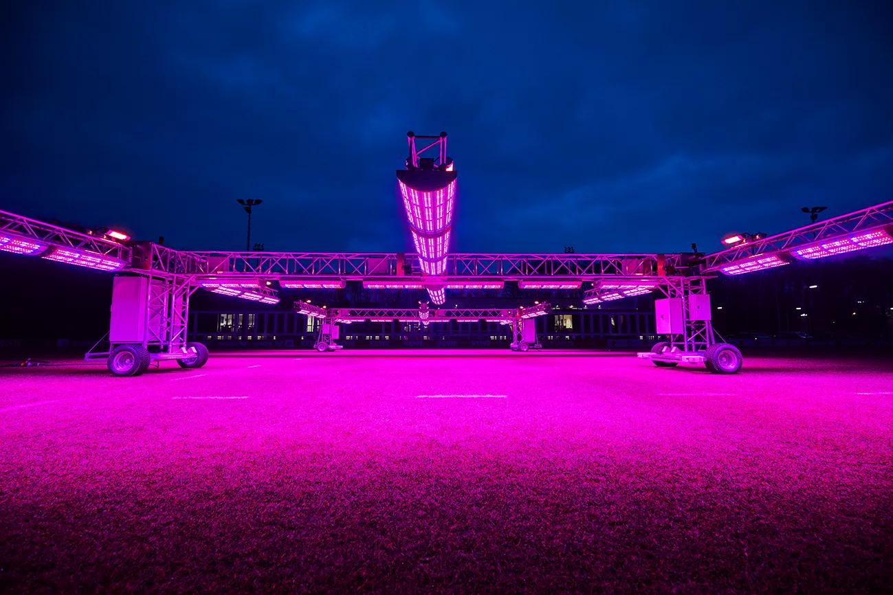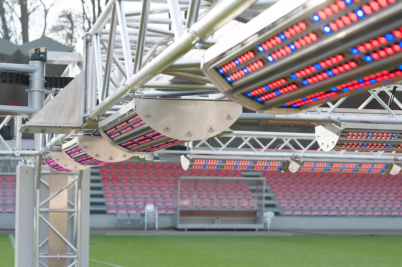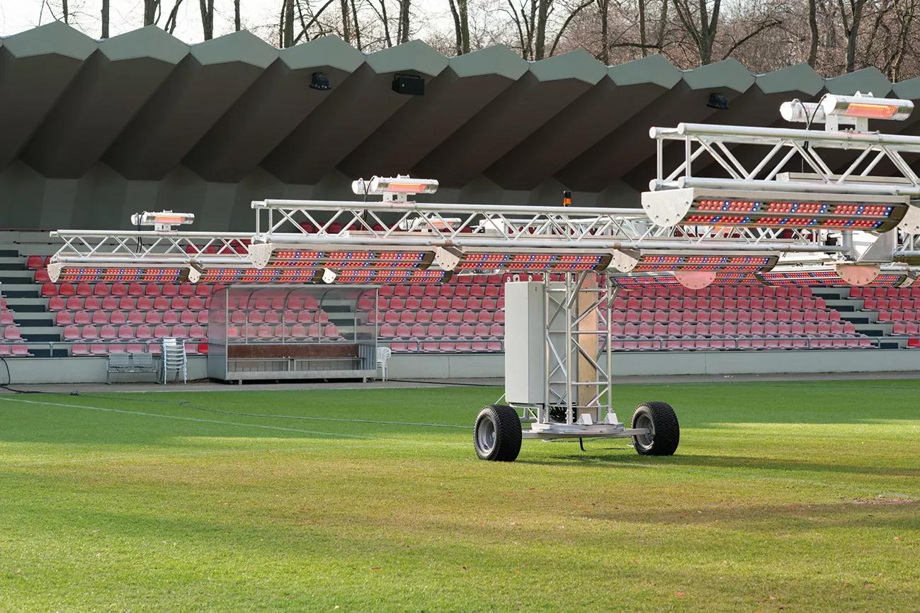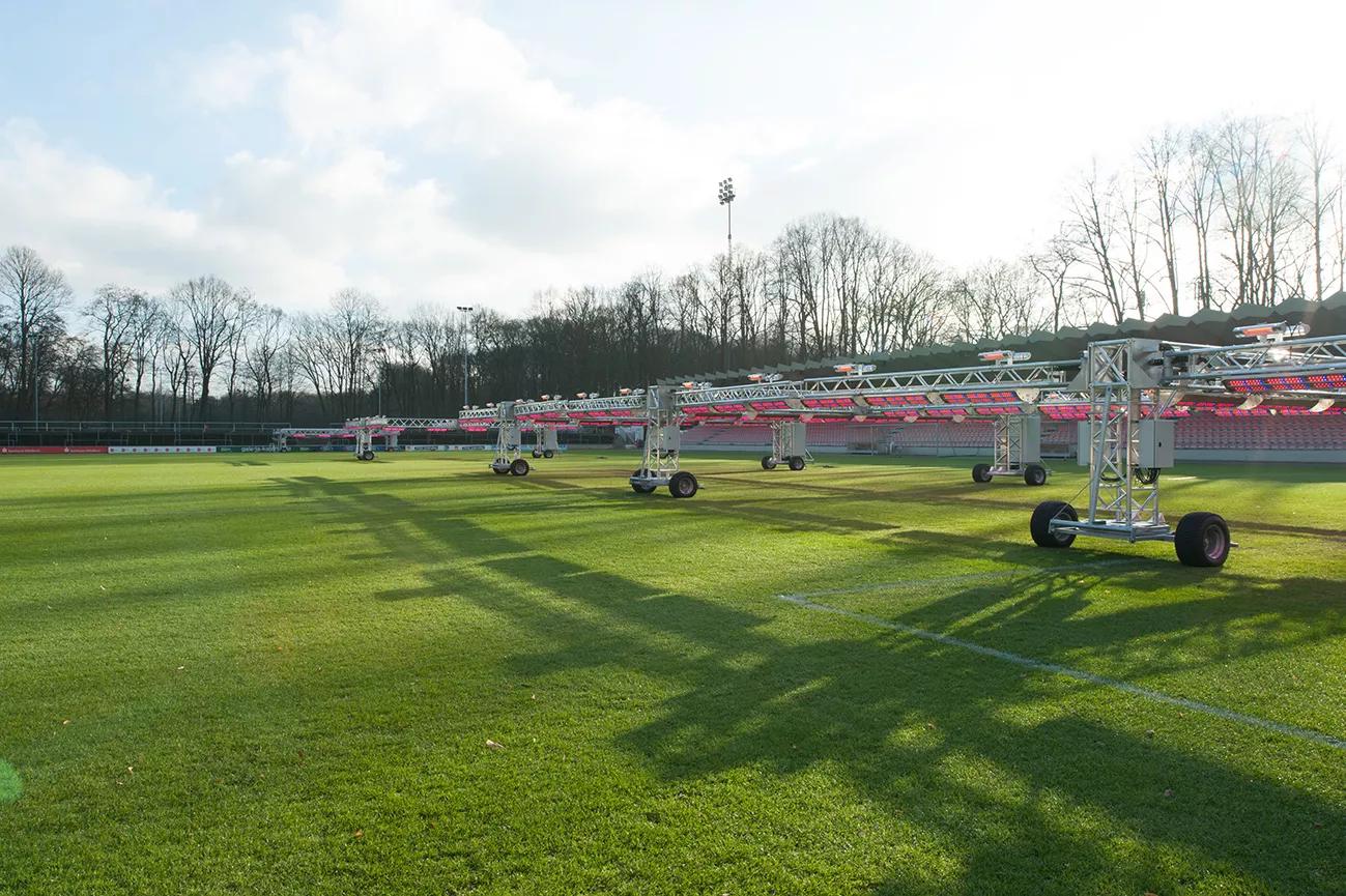 The mobile system is being used to treat the grass at the Franz Kremer stadium and also at the training facilities at the RheinEnergieSportpark – not only with the necessary light but also with heat from infrared systems to replace the lack of warmth from the sun. This targeted exposure to light and heat makes the grass grow and closes any gaps in the turf. The playing surfaces are being used every day and have to be maintained in top condition to encourage accurate passing and reduce the risk of injury due to bare patches in the pitch.