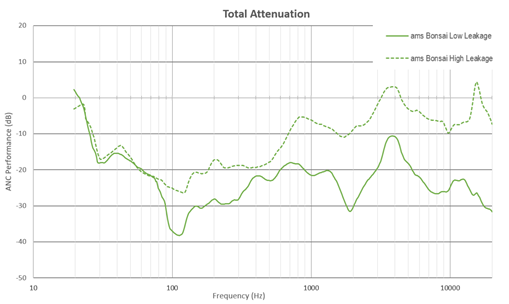 Bonsai 무선 이어폰을 통해 달성되는 노이즈 감쇠 성능은 매우 인상적입니다. 이 그래프는 높거나 낮은 누설에 노출되었을 때 Bonsai 무선 이어폰이 제공하는 노이즈 감쇠 성능을 보여줍니다.