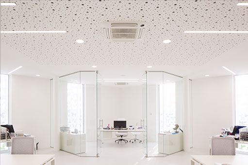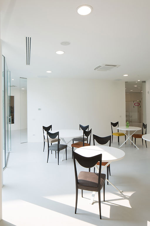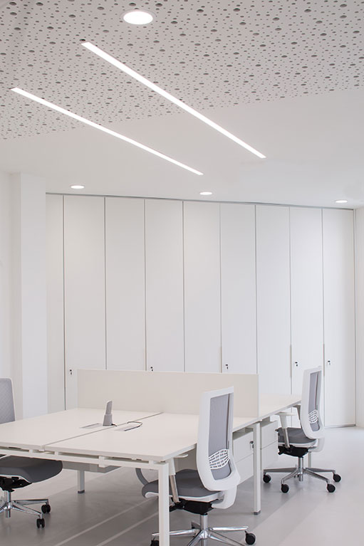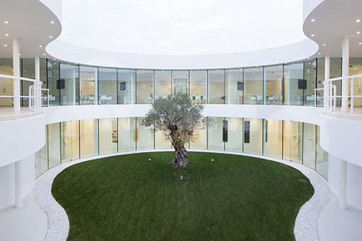 The lighting design should not detract from the architecture of the new location but harmonise with it via a discreet level of restraint; for this reason all luminaires in the interior were recessed into the ceilings. Round Lunis downlights were installed along the border areas of the curved walls and in the conference rooms with Darklight reflectors and various beam angles ensuring flexible and comfortable lighting. The laboratories and office spaces are equipped with linear luminaires compliant with interior workplace regulations installed above the workstations. All transit routes near the desks were equipped with Lunis 2 downlights and high lumen-output, wide distribution Compact downlights are used in the foyer, the restaurant area and the main circulation areas. The tunnel joining the office building with the laboratories and production areas is illuminated with the linear, modular Lumilux Combi LED system. CL LED spotlights installed in the interior courtyard of the ground storey highlight a large and resplendent olive tree. DALI technology controls and dims all LED modules.