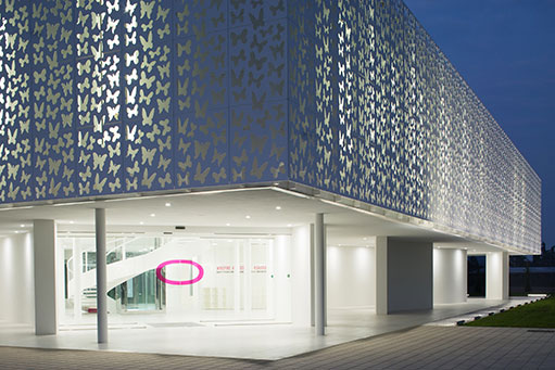 Visitors to the new headquarters are immediately impressed by the slender structure with highly original and purist lines, surrounded by rural greenage. A swarm of backlit butterflies decorates the facade of the building and attracts a high degree of attention. The Omnicos headquarters are not only architecturally but also technically state-of-the-art – for example in terms of climate neutrality. Omnicos placed maximum importance on efficiency and sustainability not only with its energy supply but also with regard to the lighting concept: the bright and generously-dimensioned building features a geothermal and photovoltaic system and is equipped throughout with LED lighting. The headquarters with total floor space of 8,700 square metres accommodate management, research and development and production divisions.