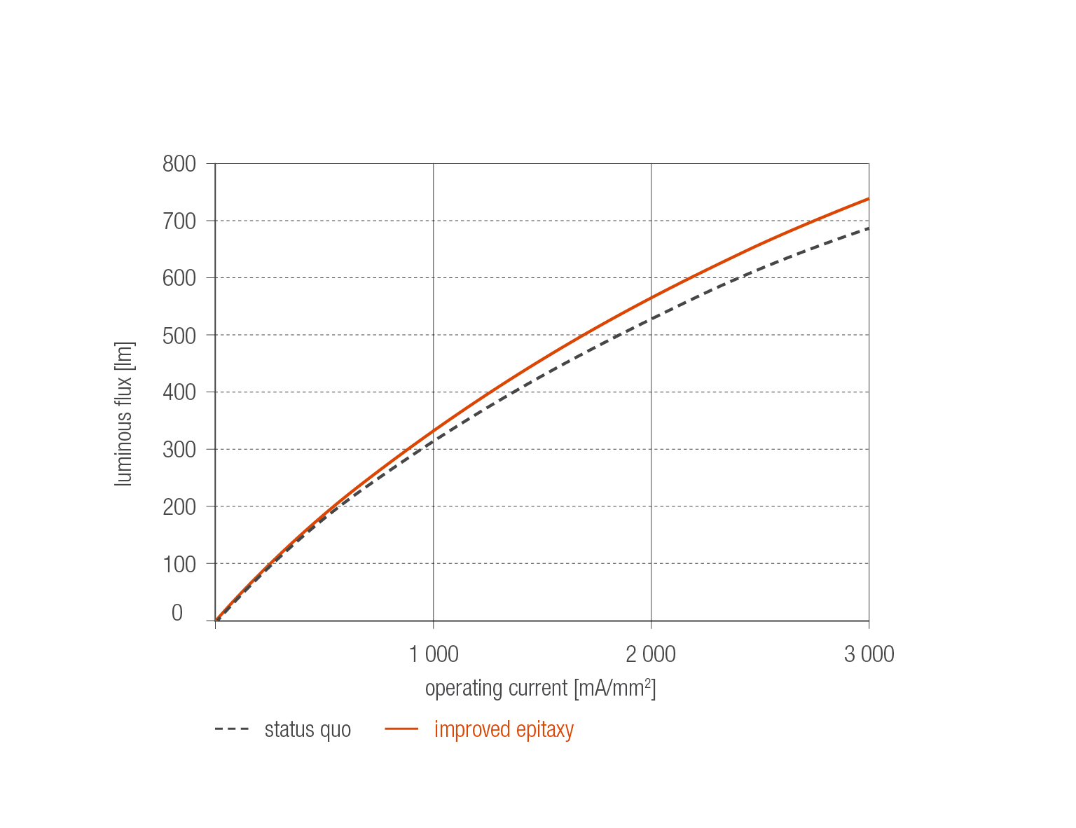 Research success at Osram Opto Semiconductors. The high-tech company has considerably improved the luminous efficacy of its high-power LEDs by reducing the unwanted droop effect at high currents. This development was made possible by optimized epitaxial processes. At a current density of 3 A/mm² the quantum efficiency of the LEDs is now a full 7.5 percent above the previous level.