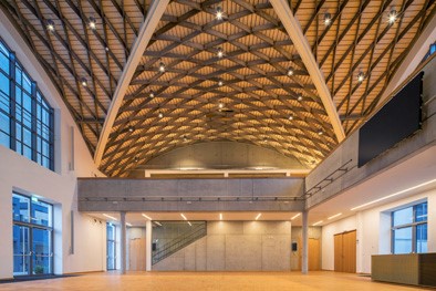 The marinaforum Regensburg, one of Bavaria's most modern and sustainable conference and congress centres, was inaugurated in April 2018. It is not a complete new building, but "builds" on the listed substance of the former old slaughterhouse in a way that conserves resources. The former main building, named the Zollingerhalle after the architect Friedrich Zollinger, also forms the core of the marinaforum. It comprises the Large Forum with around 600 m2 and space for up to 750 people, the Small Forum with space for up to 170 people and eleven workshop rooms that can be used individually and also combined. The sun-drenched foyer and the peripheral open gallery round off the unique architecture. A special eye-catcher is the timber ceiling construction in so-called Zollinger lamella construction with a ceiling height of up to 15 m at the highest point, extending over the entire building and always visible.