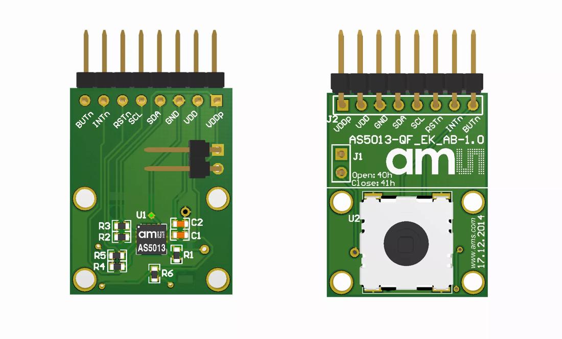 The AS5013 Adapter Board allows an easy and fast evaluation of the AS5013 contactless miniature joystick. By moving the EasyPoint module on the front side of the board it is possible to check the functionality of the AS5013. To connect the AS5013 on the adapter board to a microcontroller the single row 2.54mm 8-pin header is used. The adapter board can be easily connected to an existing application.