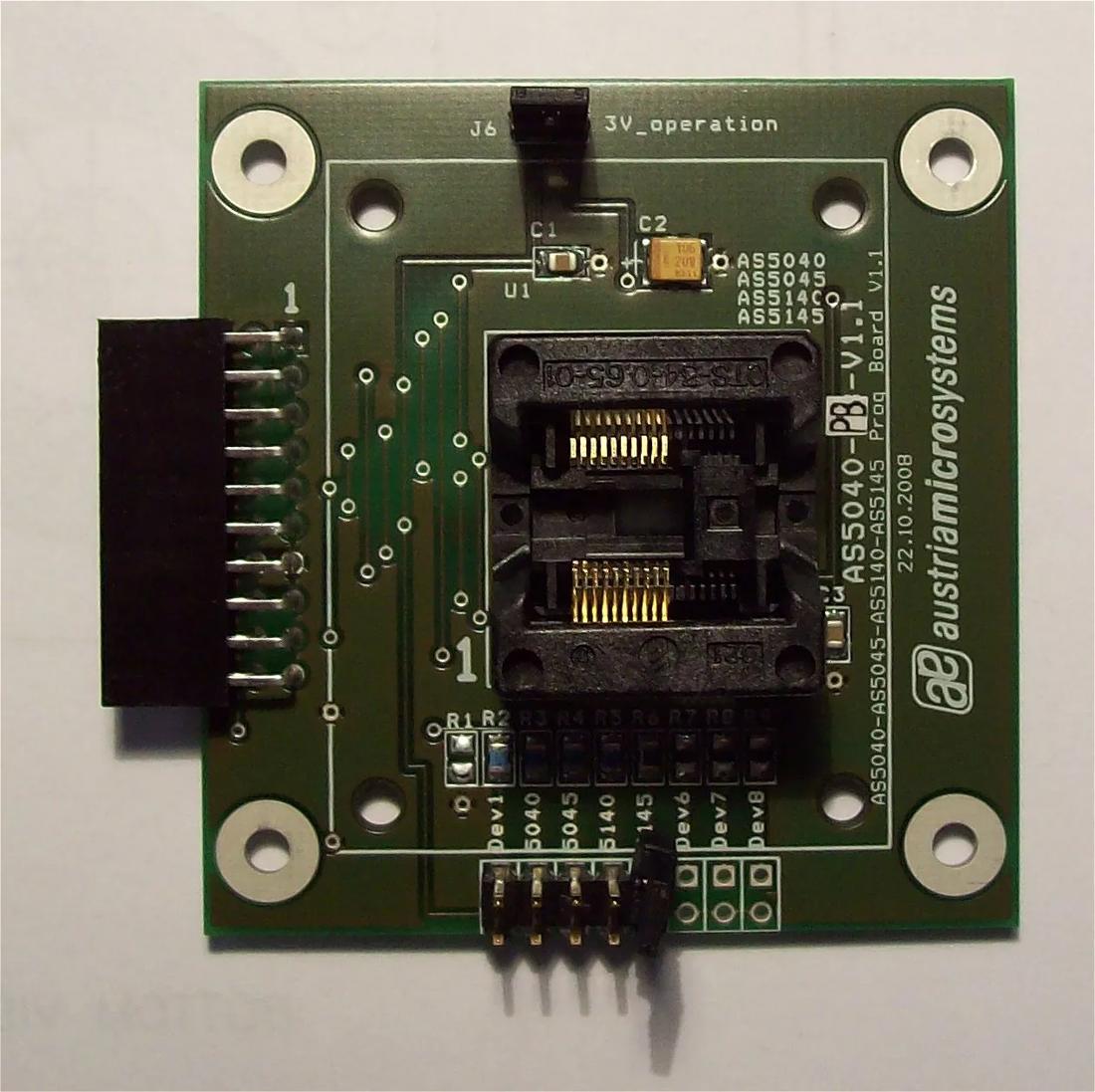 The AS5040-PB programming board is used for quick programming the AS5040, AS5045, AS5140 and AS5145 magnetic rotary position sensors without soldering due to its ZIF socket. This board must be used in combination with the SD4Y-Programmer, which provides the chip with the adequate OTP programming commands.