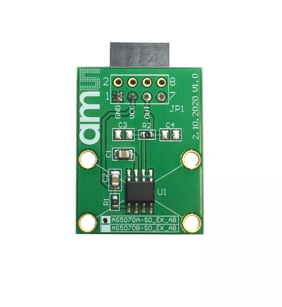 The AS5070 adapter board is a small PCB allowing simple and quick testing or evaluation of the AS5070 magnetic position sensor without the need to design and manufacture an own PCB.