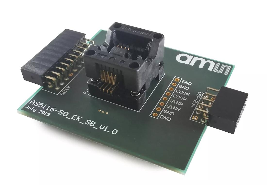 The AS5116-SO_EK_SB socket board is used for quick programming of the AS5116 magnetic rotary position sensors without soldering due to its ZIF socket. This board is used in combination with the USB I&P Box or the SD4Y production programmer.