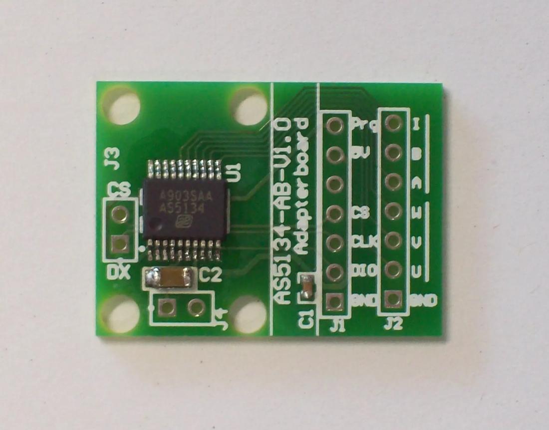 The AS5134-AB Adapter Board allows you an easy-to-use evaluation of the principle function of the AS5134 magnetic position sensor in your own system design. This small factor board includes the position sensor with its necessary external components. All relevant signals are available on a 2.54mm header footprint and can be easily wired to your own application.