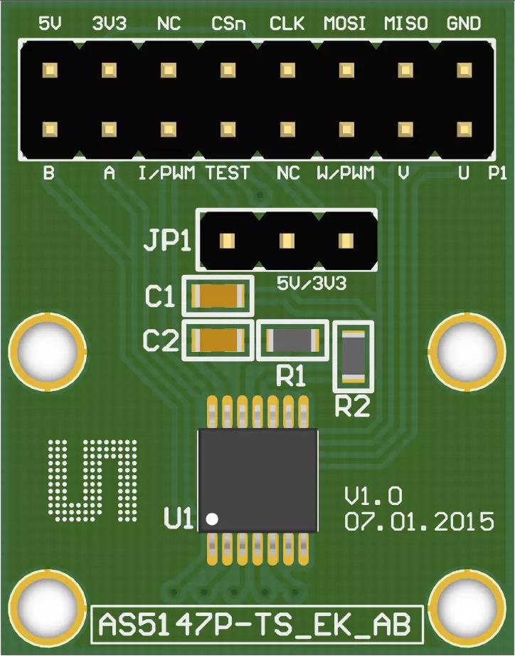 The adapter board allows an easy and fast evaluation of the AS5147P rotary magnetic position sensor in the lab or together with an existing system. This small board is fully assembled with the AS5147P position sensor and its necessary external components. All relevant signals are available on a dual-row 2.54mm 4-pin header footprint and can be easily wired to an existing application.