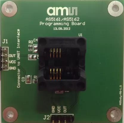 The AS516X Socket Board is used for quick programming the AS5161 and AS5162 magnetic angle position sensor without soldering due to its ZIF socket. This board can be used in combination with the UART interface board and the AS5x6y software, which provides the chip with the adequate OTP programming commands.