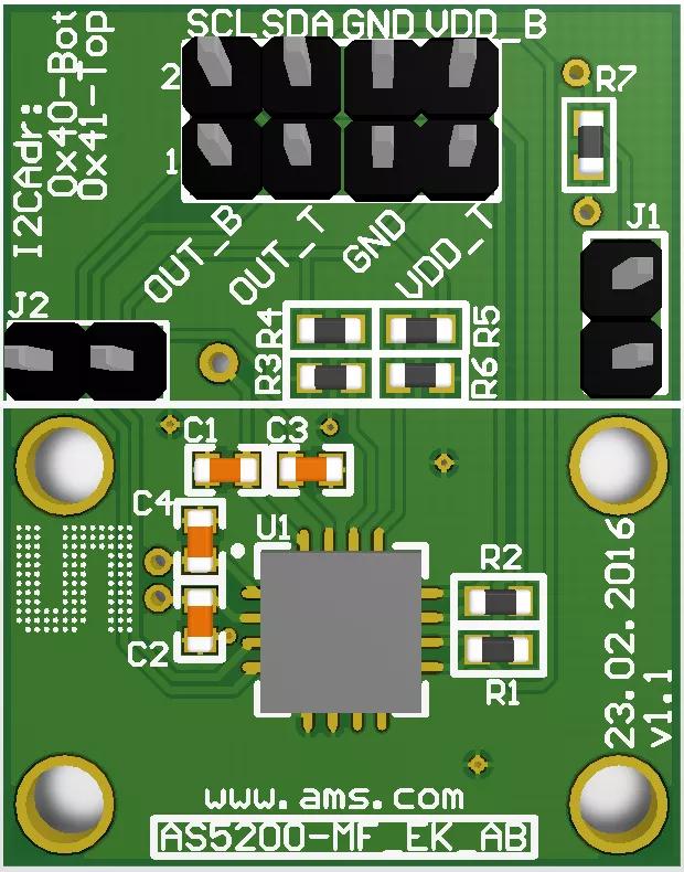 The adapter board of AS5200L allows you to evaluate the AS5200L, one of our automotive qualified dual die sensors, with all its features. The adapterboard consists of the AS5200L position sensor and its necessary external components. All relevant signals are available on a dual-row 2.54mm 4-pin header footprint and can be easily wired to an existing application. To read out the sensor over I2C connect the sensor to a standard microcontroller.