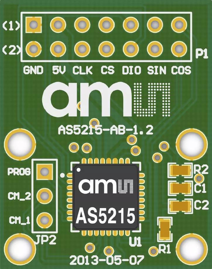 The AS5215 Adapter Board allows you an easy-to-use evaluation of the principle function of the AS5215 magnetic position sensor in your own system design. This small factor board includes the position sensor with its necessary external components. All relevant signals are available on a 2.54mm header footprint and can be easily wired to your own application.