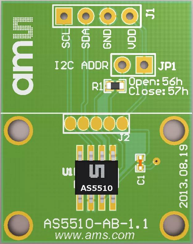 With the AS5510-SOIC8 Adapter Board it is possible to get an easy evaluation possibility of the AS5510 linear incremental magnetic position sensor in SOIC8 package. This breakout board is fitting to any I²C bus system. Power up the board (2.5V to 3.6V supply), and you can immediately start measuring the magnetic field passing through the position sensor. The position of a simple 2-pole magnet moving horizontally over the IC can be easily determined. This small evaluation board is fully assembled with AS5510 position sensor in SOIC8 package and its necessary external components. You can easily integrate the AS5510-SOIC8 Adapter Board to your own application by using the single row 4-pin header, where an easy access is possible.