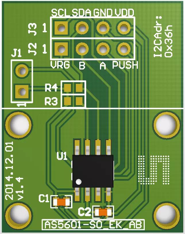 The adapter board allows an easy and fast evaluation of the AS5601 rotary magnetic position sensor in the lab or together with an existing system. This small factor board is fully assembled with AS5601 position sensor and its necessary external components. All relevant signals are available on a dual-row 2.54mm 4-pin header footprint and can be easily wired to an existing application.