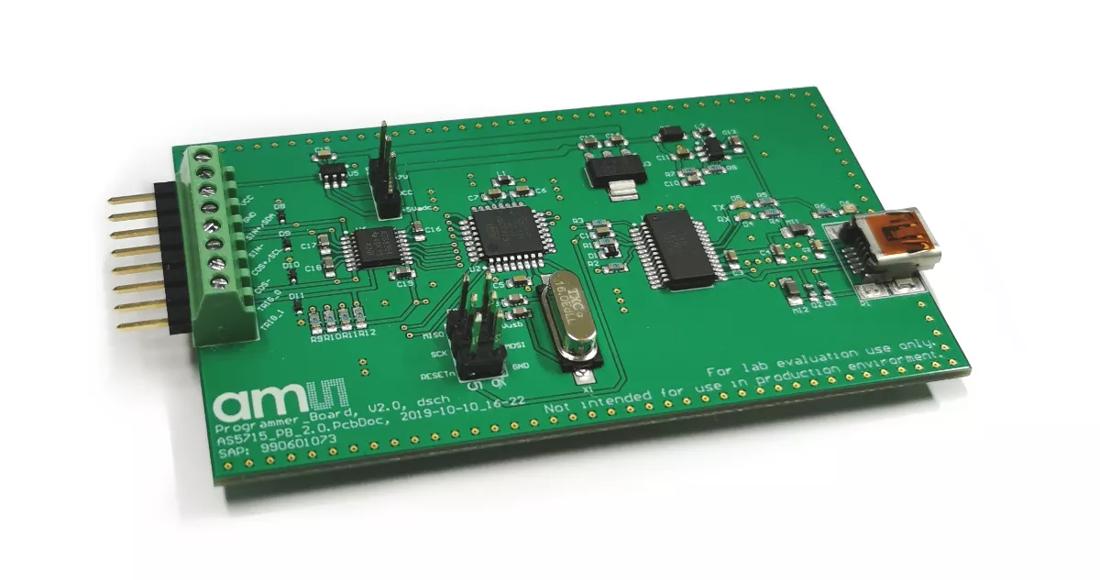 The Evaluation Programmer Board allows a quick and easy evaluation of the functionality of the AS5715R inductive position sensors. It can be used easily with the Reference Board or some individual design. It has a USB interface (for PC connection) and a 6-pin connector for the IC (or reference board). The supply is per USB connection.