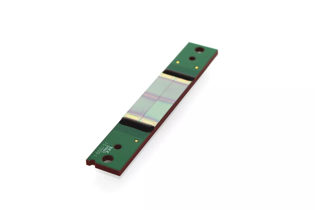 The reference design is an example of a 16-slice CT detector module, featuring the AS5950 CT detector sensor chip. The AS5950 combines ADC and photodiodes side-by-side on a single CMOS chip. Therefor there is no need of assembling ADCs on the bottom side of the board. This two-side buttable module reference design has 2x2 pcs of AS5950 assembled on one substrate to build a sensor area of 32 x 16 mm². The sensor is directly assembled using a wire bonding process for manufacturing of a cost optimized CT module. It features a single standard flex connector on the bottom side to connect the board to an FPGA.