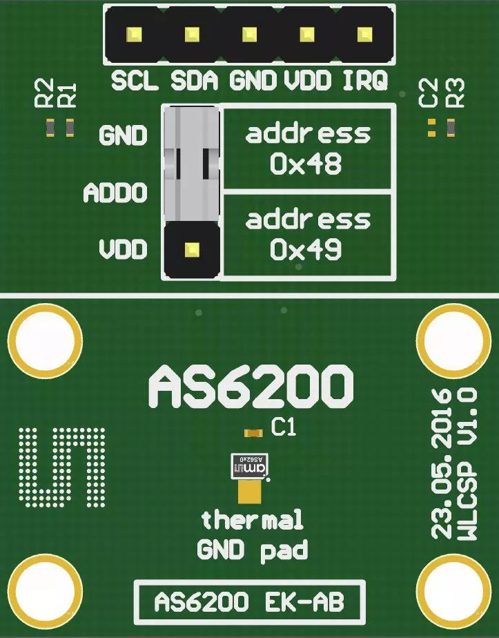 The AS6200 adapterboard is a simple PCB to enable an easy evaluation of the ams digital temperature sensor. The board features an AS6200 digital temperature sensor, a decoupling capacitor and pull-up resistors. The included jumper is an easy way of setting the I²C address of the sensor. A 5x1 pin header with a 2.54mm pitch offers all necessary interfaces to connect the adapterboard to your application processor.