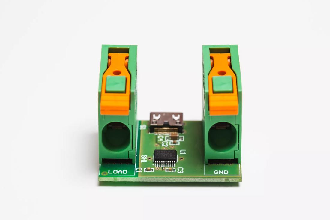This Copper-Shunt based current sensor demo utilizes the AS8510 for current measurement and thermal-coefficient compensation. It is intended for a current range of ~40A operation and 60A maximum. Two measurement paths are provided. The left one uses the AS8510’s internal temperature sensor and the right one uses a fine copper meander trace to sense temperature.