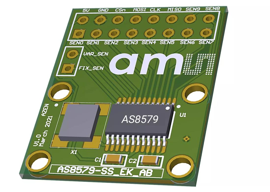 The Adapter Board is designed for first evaluation of AS8579 capacitive sensors features and benefits. The PCB is equipped with all basic necessary components for easy plug'n'play evaluation.