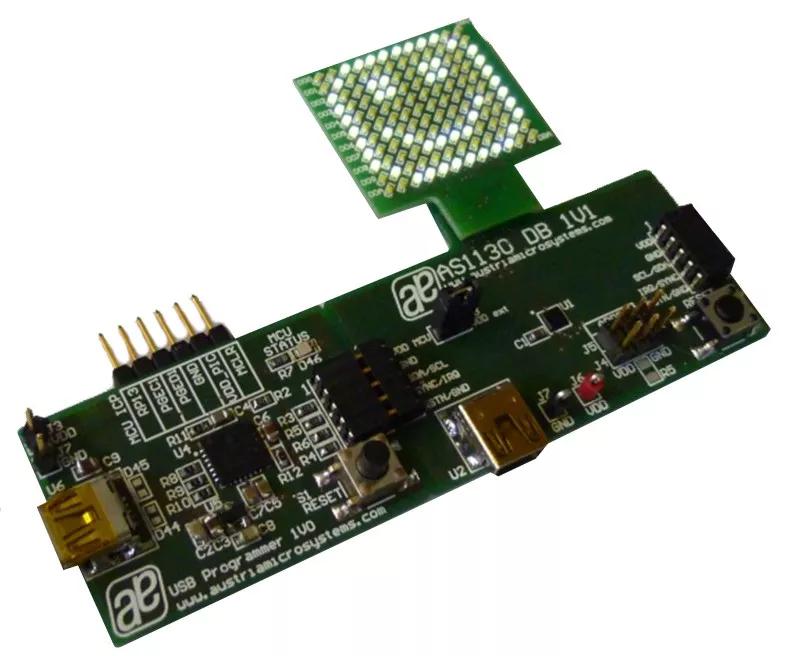 The demo kit includes the AS1130 Evaluation Board, the USB interface board, a 132 single LEDs (11x12matrix) connecting board, a 42 RGB LEDs (6x7matrix) connecting board and the required SW. On the AS1130 Evaluation Board the 20-balls WL-CSP version is mounted.