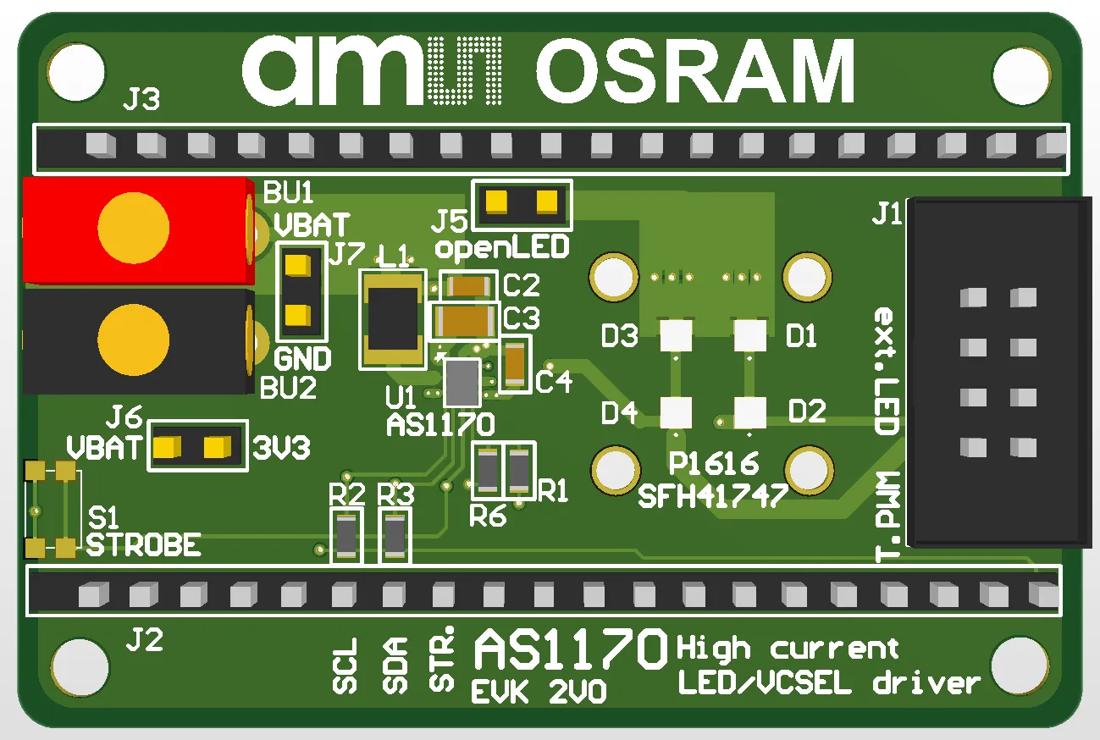 The AS1170 Evaluation Kit is a platform to evaluate the AS1170 2 channel, high current LED/VCSEL driver. It includes a PC graphical user interface Software (GUI) and a ESP32 micro controller board which provides access to the driver configuration. The EVK is assembled with tiny SFH41747 IR LEDs with P1616 PCB Footprint. In addition to the default LED configuration a break-out board is included to enable testing of different LED footprints such as OSLON black, SYNIOS P2720 and other ams OSRAM LED or VCSEL types. A user guide is included which describes how to use the evaluation kit and its software. The EVK is assembled with tiny infrared LEDs OSLON™ P1616 Lens, SFH 41747. In addition to the default LED configuration a break-out board is included to enable testing of different LED footprints such as OSLON™ Black, SYNIOS™ P2720 and other LEDs or VCSEL types.