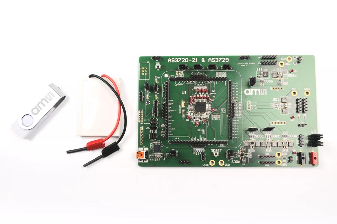 The AS3721/29 Evaluation Kit allows you to easily evaluate the principle functionality of the AS3721 power management unit. All functions and registers can be controlled via the included PC GUI software.