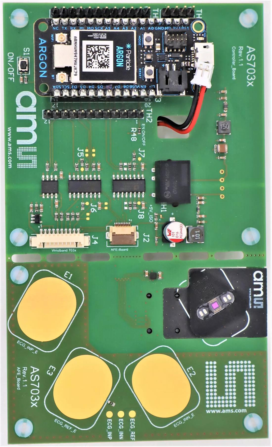 The operation of the AS7038RB is based on photoplethysmography (PPG) and electrocardiogram (ECG).PPG is the most used HRM method which measures the pulse rate by sampling light modulated by the blood vessels, which expand and contract as blood pulses through them. ECG is the reference for any measurement of the bio potential generated by the heart. The AS7038RB is supported by algorithms converting the PPG and ECG readings into digital HRM, HRV, Continuous Blood Pressure and SpO2 values. The cuff-less Blood Pressure Measurement has been optimized to fulfill the IEEE Std 1708-2014.The detector includes the photo-sensor, analog front-end (AFE) and sequencer as well as application software. In addition to HRM/HRV, Blood Pressure and SpO2, the detector also enables skin temperature and skin resistivity measurements by providing interfaces to external sensors.The AS7038RB’s low-power design and small from factor is particularly well suited to application in fitness bands, smart watches, sports watches and smart patches, in which board space is limited and in which users look for extended, multi-day intervals between battery recharges.
