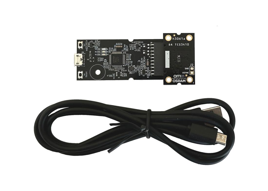 The TCS3410 Evaluation Kit comes with everything needed to evaluate the TCS3410 ALS RGB sensor module. The evaluation kit comprises of a main controller board with a PIC microcontroller, an industry standard USB 2.0 interface (with a USB cable), a TCS3410 daughter card, "plug-n-play" USB HID class drivers, software documentation, and GUI software allowing users to control the ALS RGB sensor settings as the PIC takes the TCS3410 I²C digital outputs to calculate ALS and RGB.