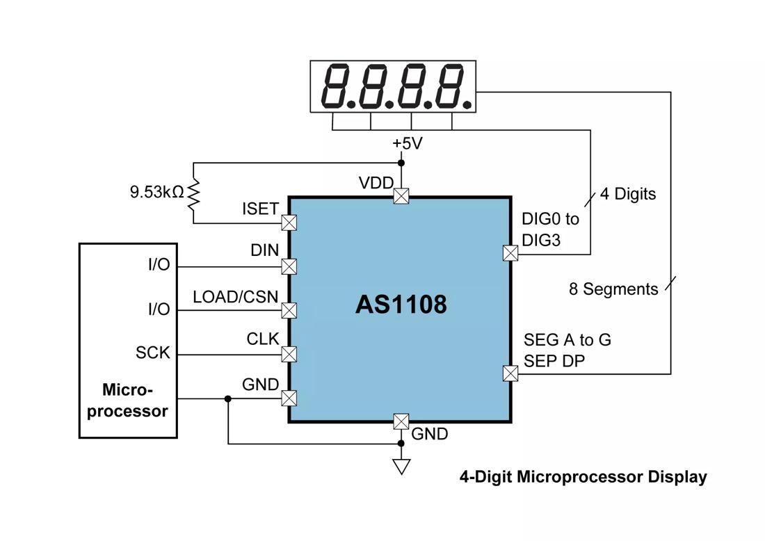 The AS1108 is a SPI interfaced, dot-matrix LED driver IC for a 4x8 LED matrix or 4 7-segment LEDs. It includes a 4-bit PWM for the entire matrix and an external resistor can be used for analog current adjustment up to 10mA per LED.