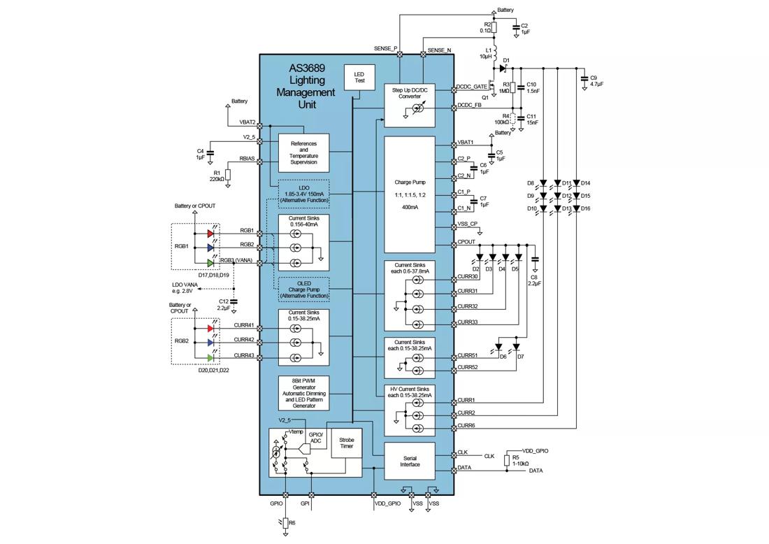 - Up to 25V/50mA for white LEDs