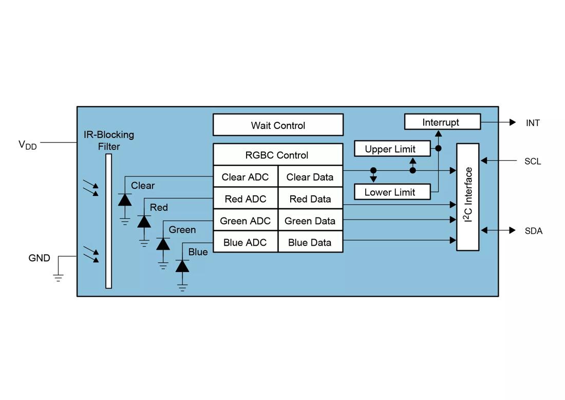 - A reference channel for color analysis (clear channel photodiode)